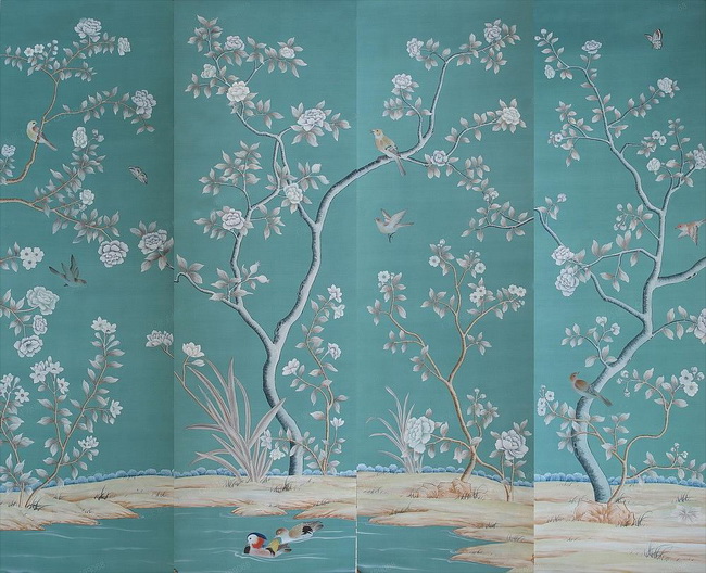 Our handmade wallpapers are devided into European landscape style and Chinoiserie style, can be painted on various background silk materials and metallic wallpaper with unique pattern color usage to fit your room styles.